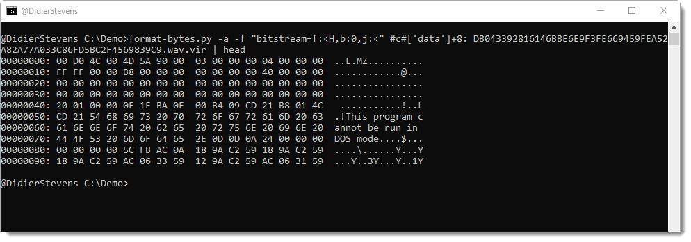 format-bytes.py -a -f “bitstream=f:<H,b:0,j:<” #c#[‘data’]+8: DB043392816146BBE6E9F3FE669459FEA52A82A77A033C86FD5BC2F4569839C9.wav.vir