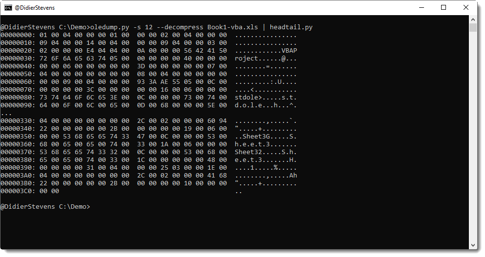 And option –decompress now does also VBA decompression (it was zlib only). This helps to decompress the dir stream of documents with VBA macros: