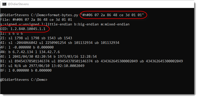 Because of CVE-2020-0601, I also introduced Object Identifier aka OID (DER) decoding. In DER encoding, an OID starts with byte 6 (excluding flags) followed by one byte indicating the length of the bytes representing the OID.