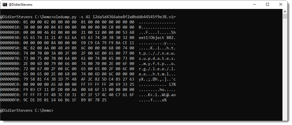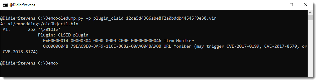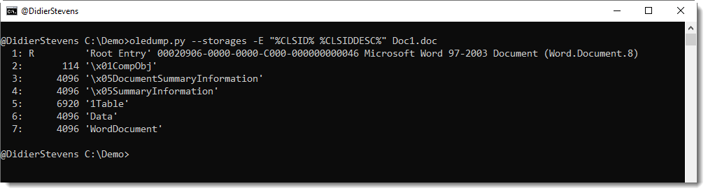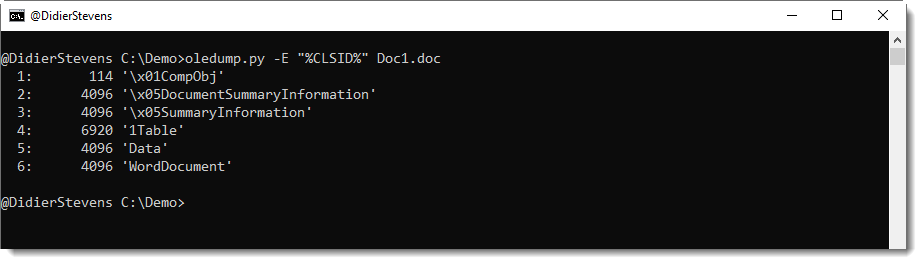 When oletools is installed, oledump.py looks up CLSIDs in this list when you use parameter %CLSIDDESC% (CLSID description). Here is the same command as before, but with parameter %CLSIDDESC%: