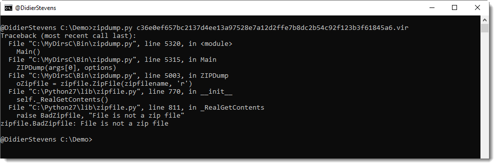 With version 0.0.16 (we are now at version 0.0.18), I updated my zipdump.py tool to handle (deliberately) malformed ZIP files. My zipdump tool uses Python’s ZIP module to analyze ZIP files.