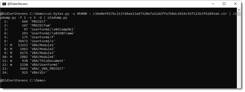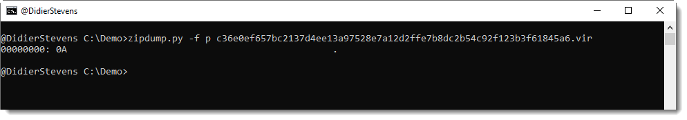 Hence, the byte we are missing here is a NULL (0x00) byte. We can append a NULL byte to the sample, and then we should be able to analyze the ZIP file. In stead of modifying the sample, I use my tool cut-bytes.py to add a single NULL byte to the file (suffix option: -s #h#00) and then pipe this into zipdump:
