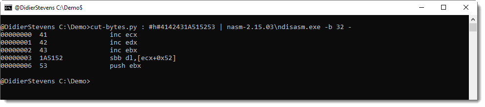 But there was an issue with Windows versions: stdin was opened in text mode, and not in binary mode. This can result in disassembly errors, like in the following example. I send 7 bytes to ndisasm via stdin, and the 4th byte is 0x1A (CTRL-Z): this is the end-of-file marker for Windows text files: