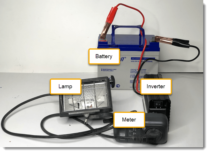Then I use this fully charged battery to power a 230V 150W halogen lamp via a 12V DC to 230V AC power inverter (modified sine wave).