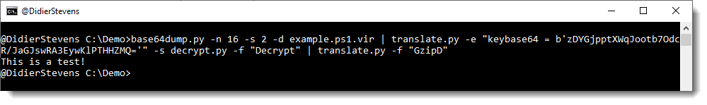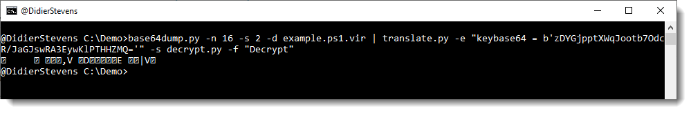 I select the second BASE64 string (payload) to pipe into translate.py, using the following small Python script (decrypt.py) to do the decryption: