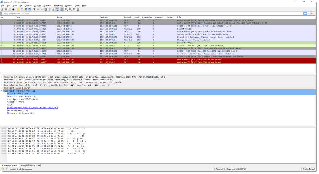 The resulting file, capture-1-with-keys.pcapng can then be opened in any instance of Wireshark, and the TLS traffic will be decrypted automatically, without having to change the configuration for the TLS protocol: