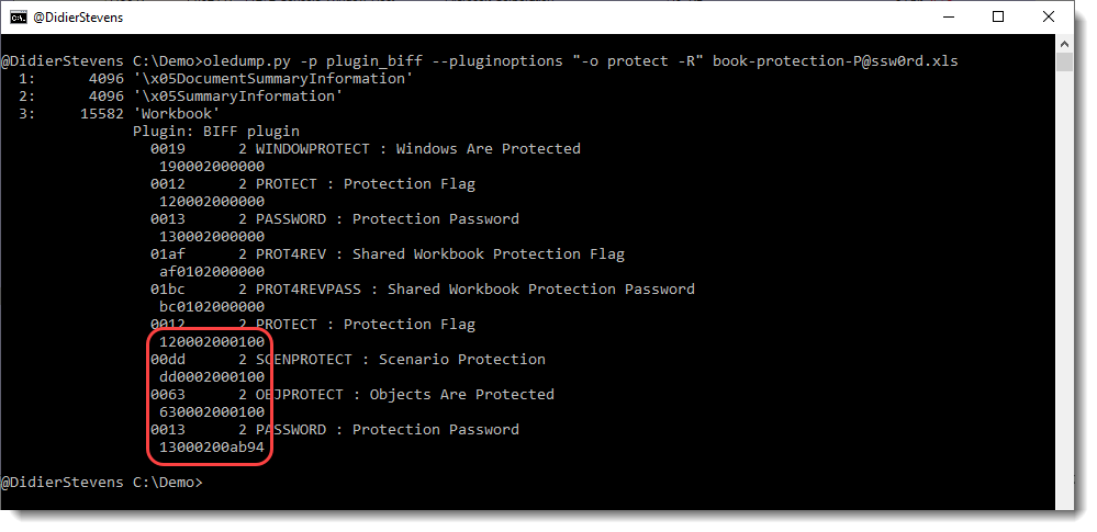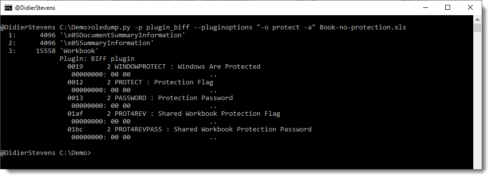 First, let’s take a look at an empty, unprotected (and unencrypted) .xls spreadsheet. With option -O protect I select the appropriate records, and with option -a I get an hex/ascii dump of the record data: