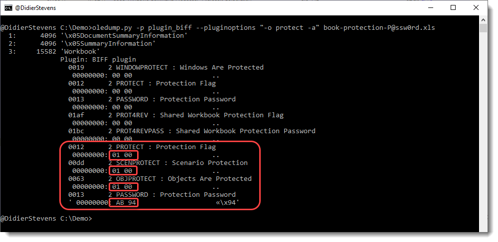 First of all we have 4 extra records, and their data isn’t zero: the flags are set to 1 (01 00 little-endian) and the Protection Password data is AB94. That is the hash of the password (P@ssw0rd) we typed to create this sheet.