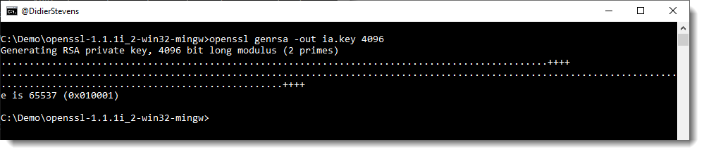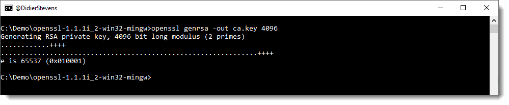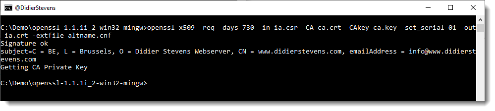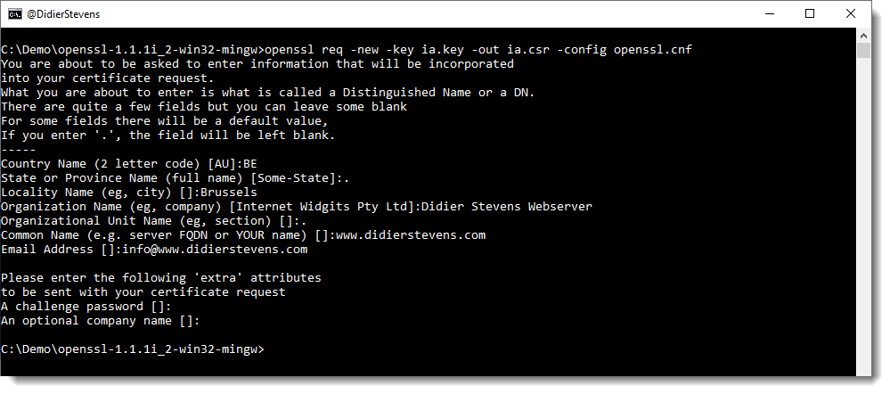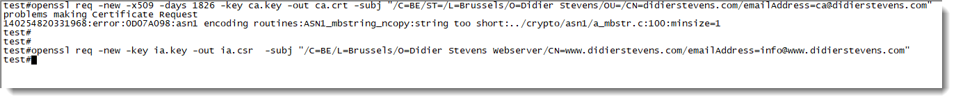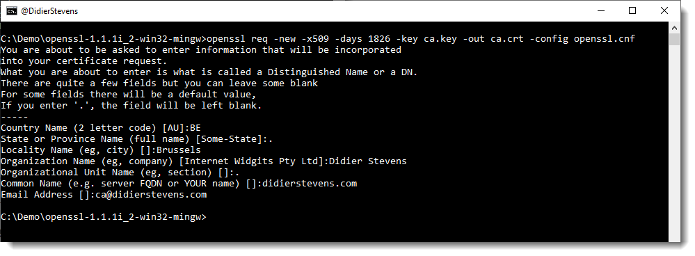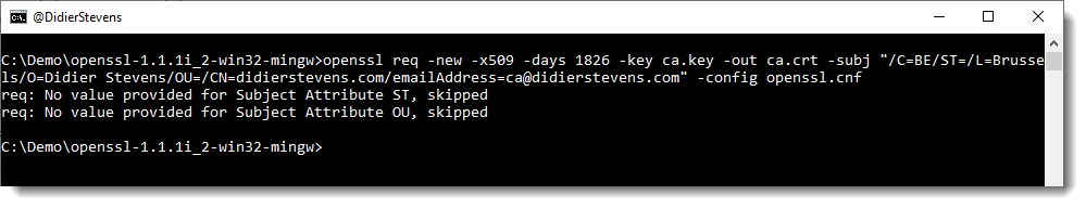 openssl req -new -x509 -days 1826 -key ca.key -out ca.crt -subj “/C=BE/ST=/L=Brussels/O=Didier Stevens/OU=/CN=didierstevens.com/emailAddress=ca@didierstevens.com” -config openssl.cnf