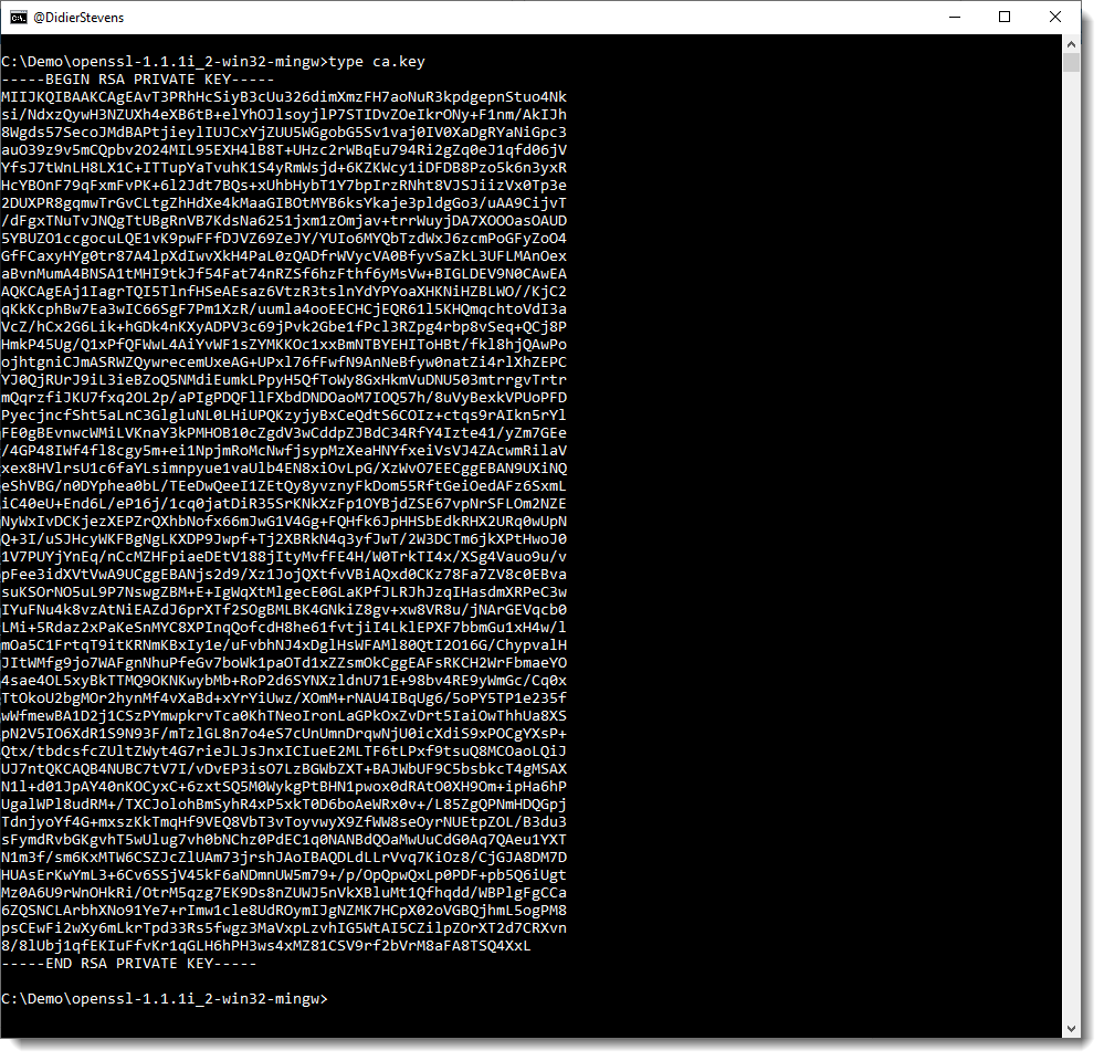 This generates a private key that is not password protected. It is stored inside file ca.key as printable text (PEM format):