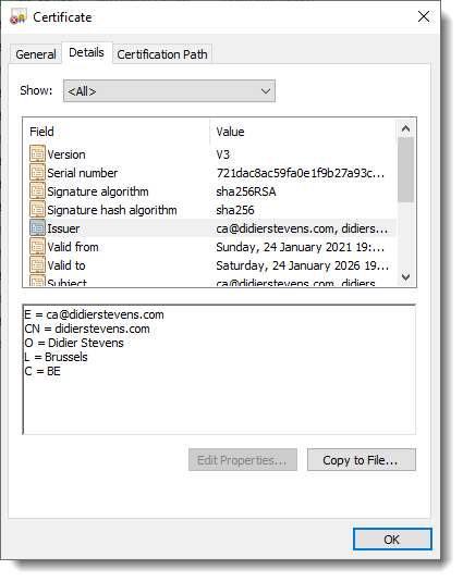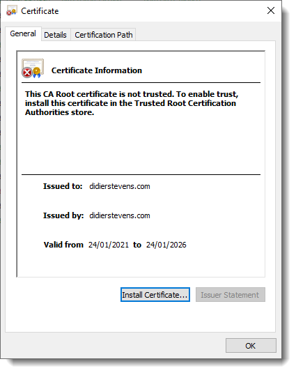On Windows, you can double-click the root certificate we just created (ca.crt), and inspect it:
