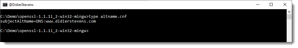 Here the command requires an extra option, that I did not use in previous how-tos. We need a small text file (altname.cnf), with the following content: