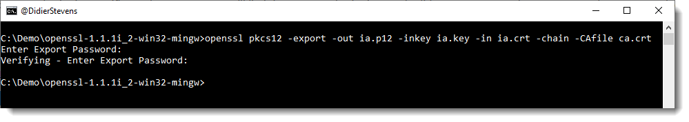 openssl pkcs12 -export -out ia.p12 -inkey ia.key -in ia.crt -chain -CAfile ca.crt