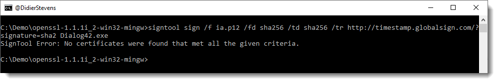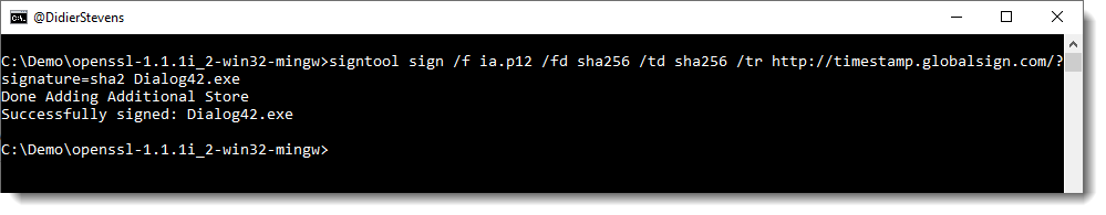 signtool sign /f ia.p12 /fd sha256 /td sha256 /tr http://timestamp.globalsign.com/?signature=sha2 Dialog42.exe