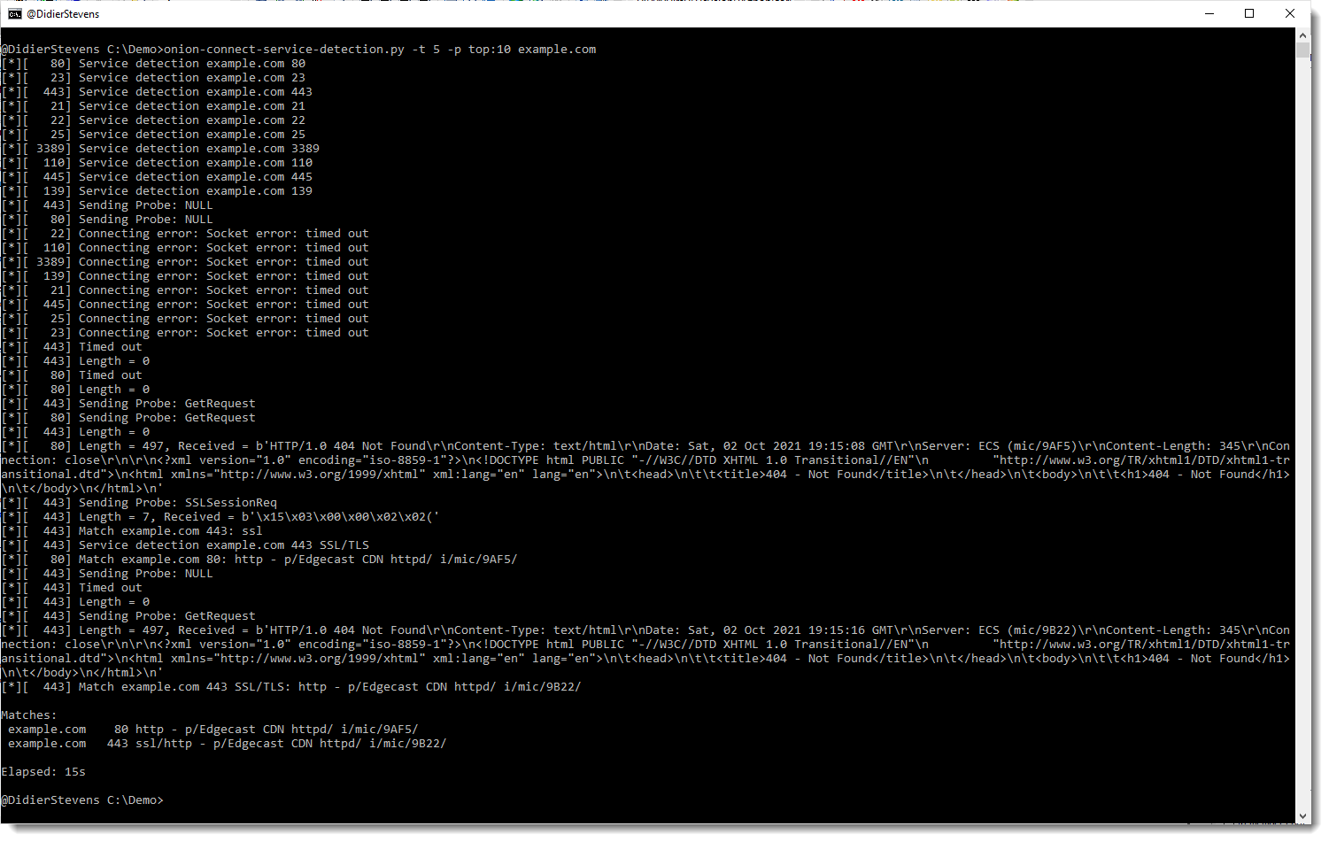 Here is an example where I use the tool to detect services on the 10 most popular ports (top:10) of example.com. With a time-out of 5 seconds.