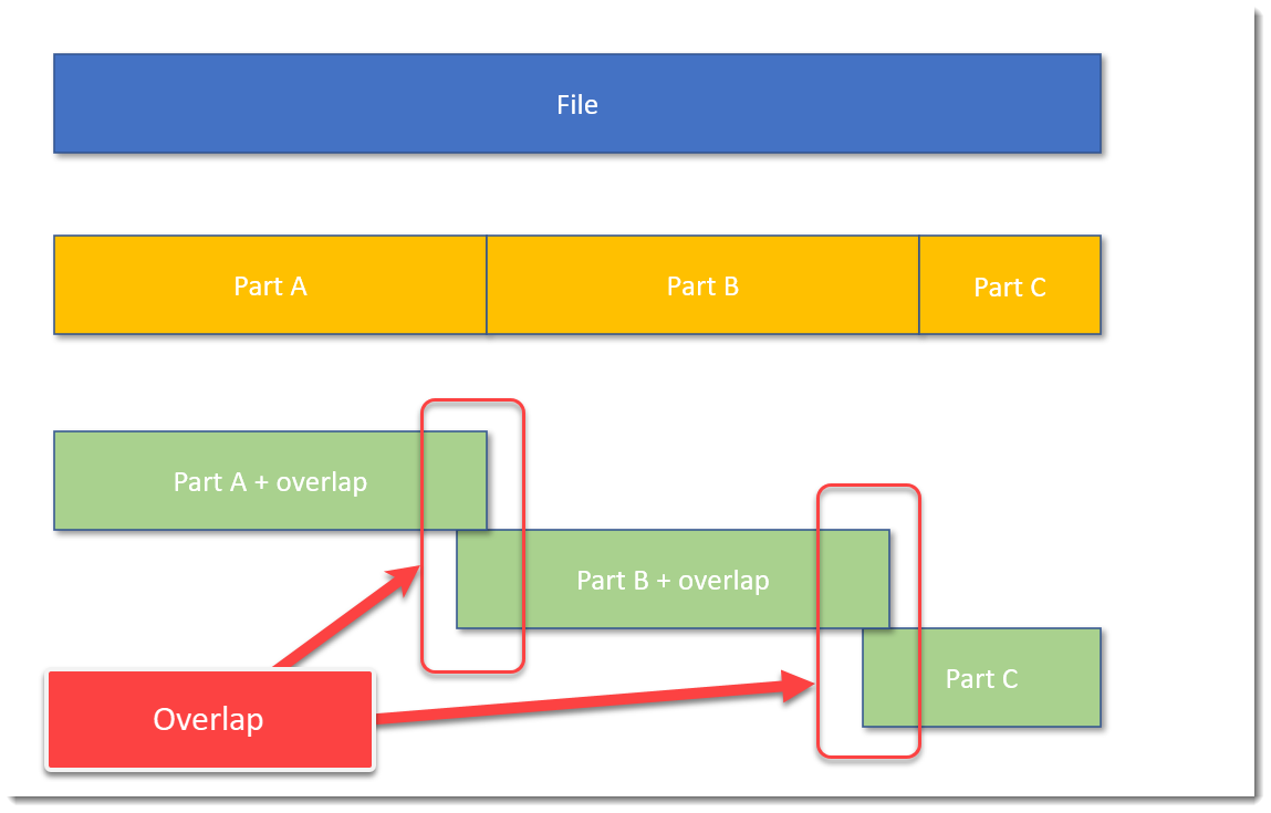 The blue block represents the original file, the yellow blocks are parts of the original file without overlap, and the green blocks represent parts of the original file with some overlap.