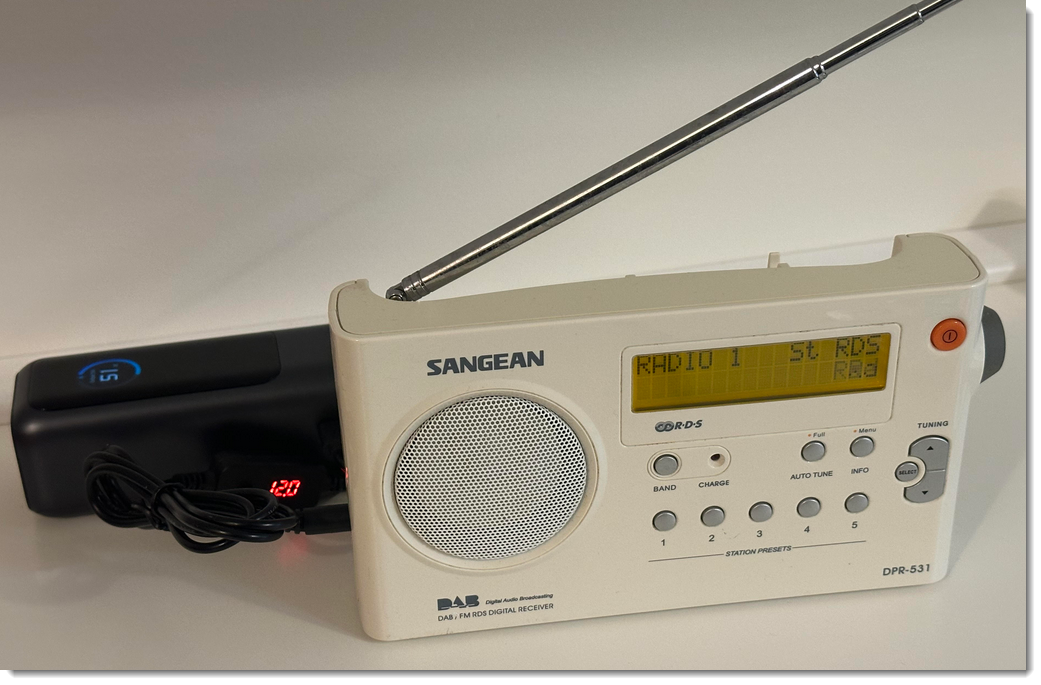 Although this setup is portable, it’s not very handy to carry around when you go away from home. So I looked around on Aliexpress for a small & cheap FM radio and selected a Junus J-555. It can be powered by two alkaline AAA batteries or by its built-in Li-Po battery. That Li-Po battery can be charged via a USB-C connector, and the radio also works while charging. But what is most important: it has a good reception of FM and AM stations when operating inside my home.