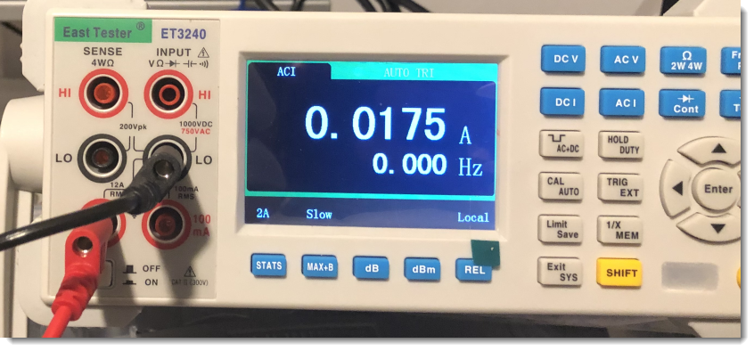 I wondered how much power it consumes in the off state. Doing some research, I found a couple of forums where people asked the same question, and getting answers that is was very little, varying from 0,01 A to 0,02 A.